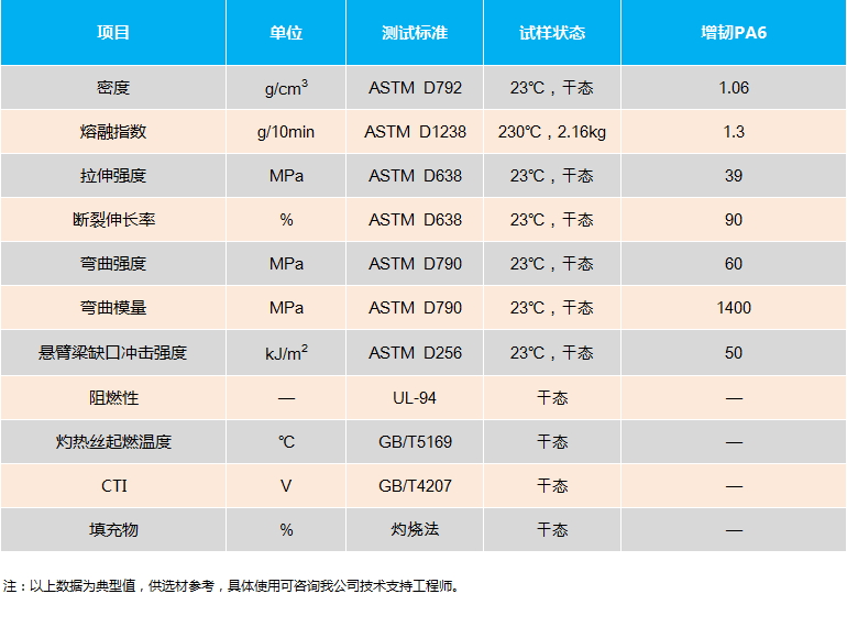 增韧尼龙6系列具有高抗冲、高载重、耐撞击、耐高/低温、优异的耐化学性,可用于脚轮及其支架配件、纺织器材、运动器材、铁路部件等。详细物性数据见下表。